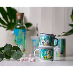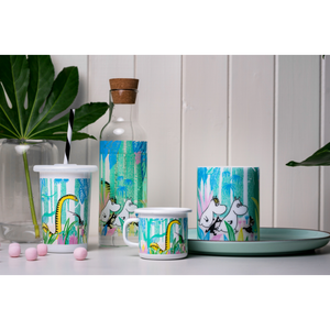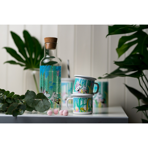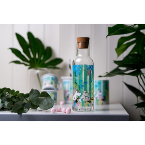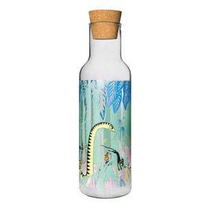 Litrowa szklana butelka z kolekcji Muminki w Dżungli. Idealne na przechowywanie soków z wyciskanych owoców, podasz w niej ulubione soki swoim pociechom.