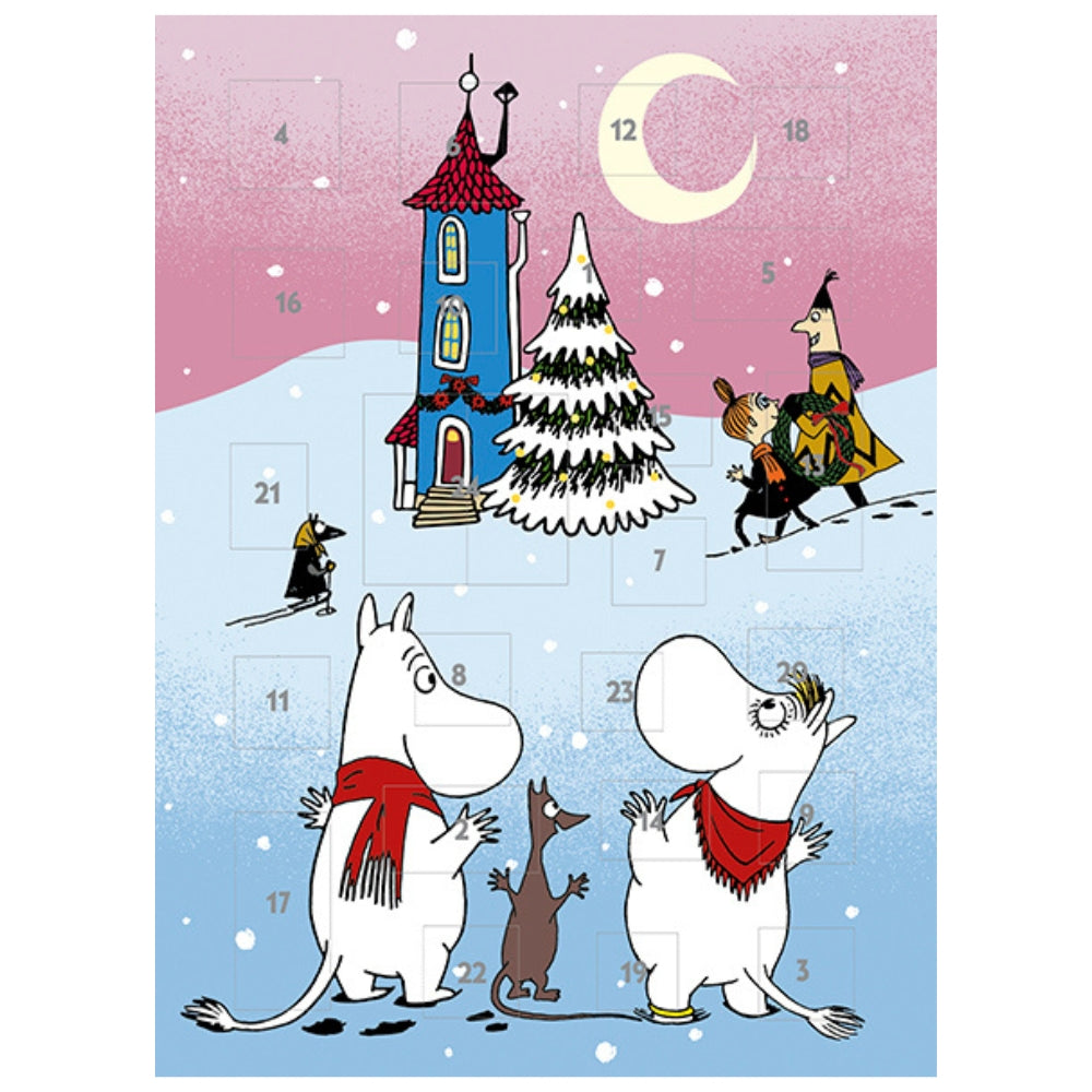 Kalendarz adwentowy w formie plakatu A4, z otwieranymi okienkami, pod którymi znajdziesz urocze ilustracje z Muminkami.