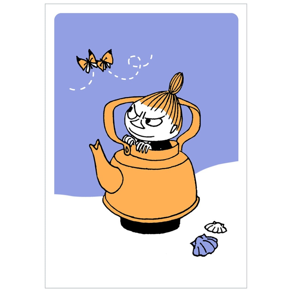 Fińska, jednostronna, tłoczona pocztówka wykonana z wysokiej jakości tektury. Obrazek przedstawia Małą Mi w imbryku. Wymiary: 105 x 148 mm.