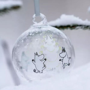 Bombka dekoracyjna z kolekcji z Muminkami z ilustracją Muminka i Migotki tańczących wokół choinki. Bombki dekoracyjne są przeznaczone do ozdabiania choinki, ale mogą również nadać miły zimowy akcent innym miejscach w twoim domu - powieś je przy oknie, drzwiach lub gdziekolwiek indziej! Wykonane ręcznie z szkła wolnego od ołowiu. Dołączona jest jasnoniebieska wstążka satynowa. Rozmiar: 9 cm.
