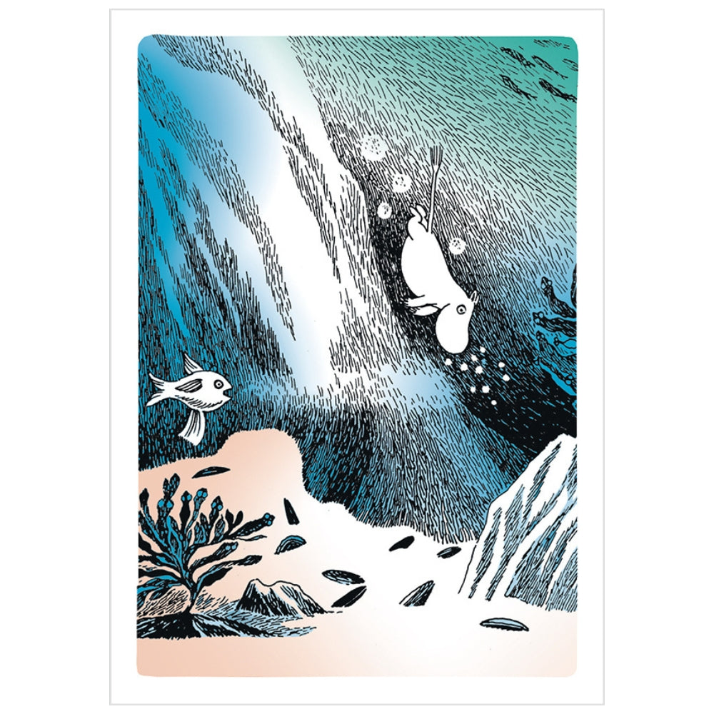 Fińska pocztówka jednostronna, wykonana z wysokiej jakości tektury. Zdjęcie przedstawia Muminka nurkującego w kierunku dna morskiego, z widocznymi w wodzie rybami, koralowcami i małżami. Oryginalna ilustracja Tove Jansson. Wymiary: 105 x 148 mm.
