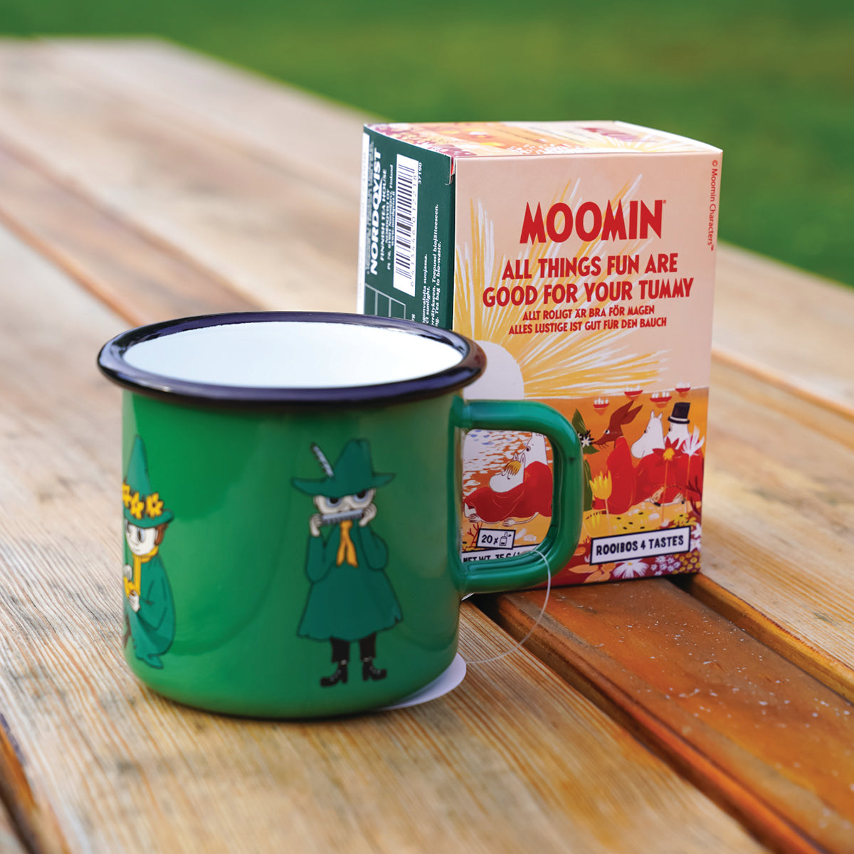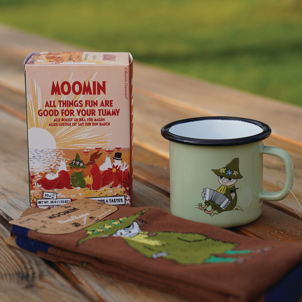 OFICJALNY MOOMIN SHOP POLSKA Zestaw 3-el. kubek emaliowany 250ml Włóczykij Muurla + Herbata w torebkach Nordqvist + skarpety 36-42 NordicBuddies