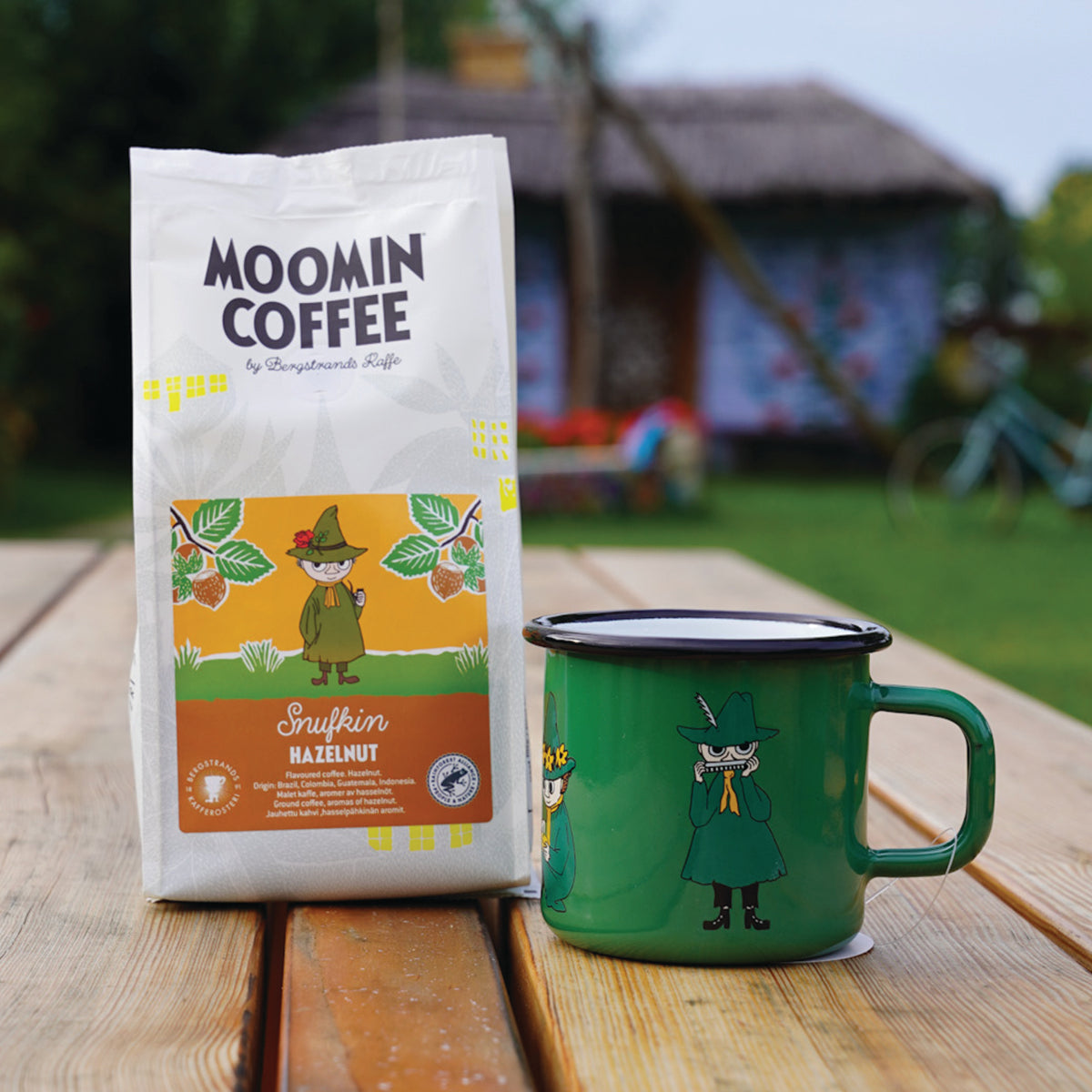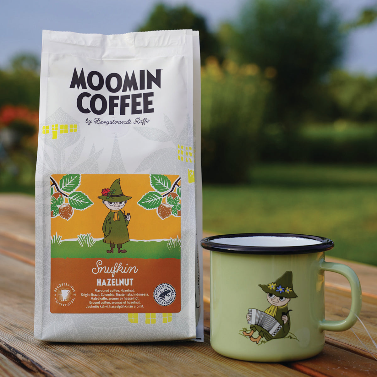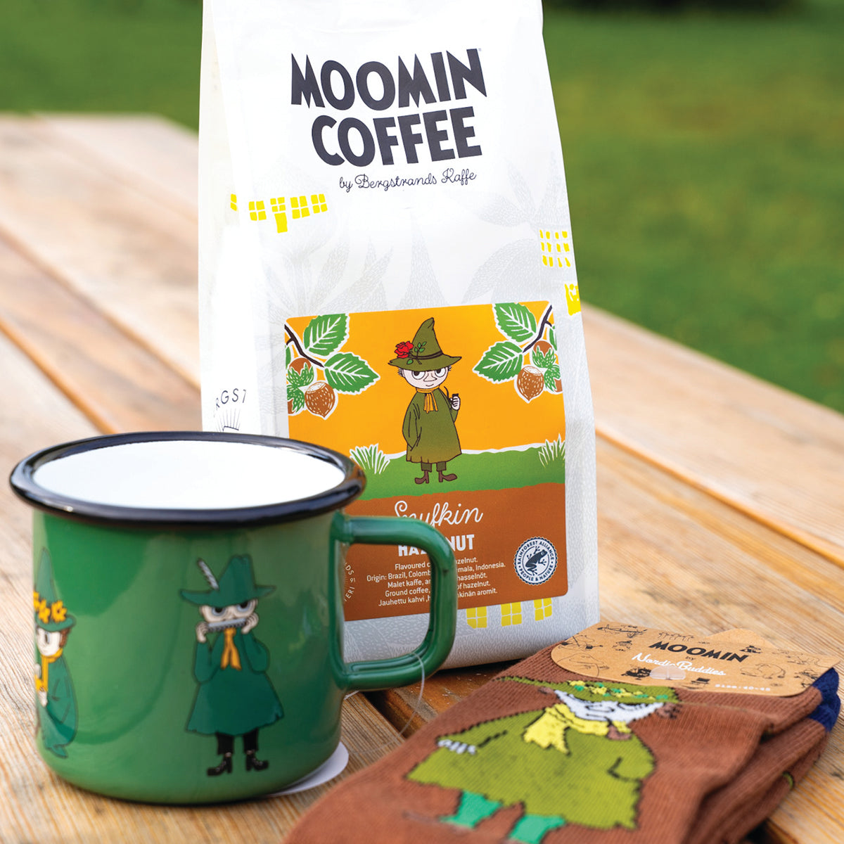 OFICJALNY MOOMIN SHOP POLSKA Zestaw 3-el. kubek emaliowany 370ml Włóczykij Muurla + kawa mielona Włóczykij 250g Bergstrands + skarpety 36-42 NordicBuddies