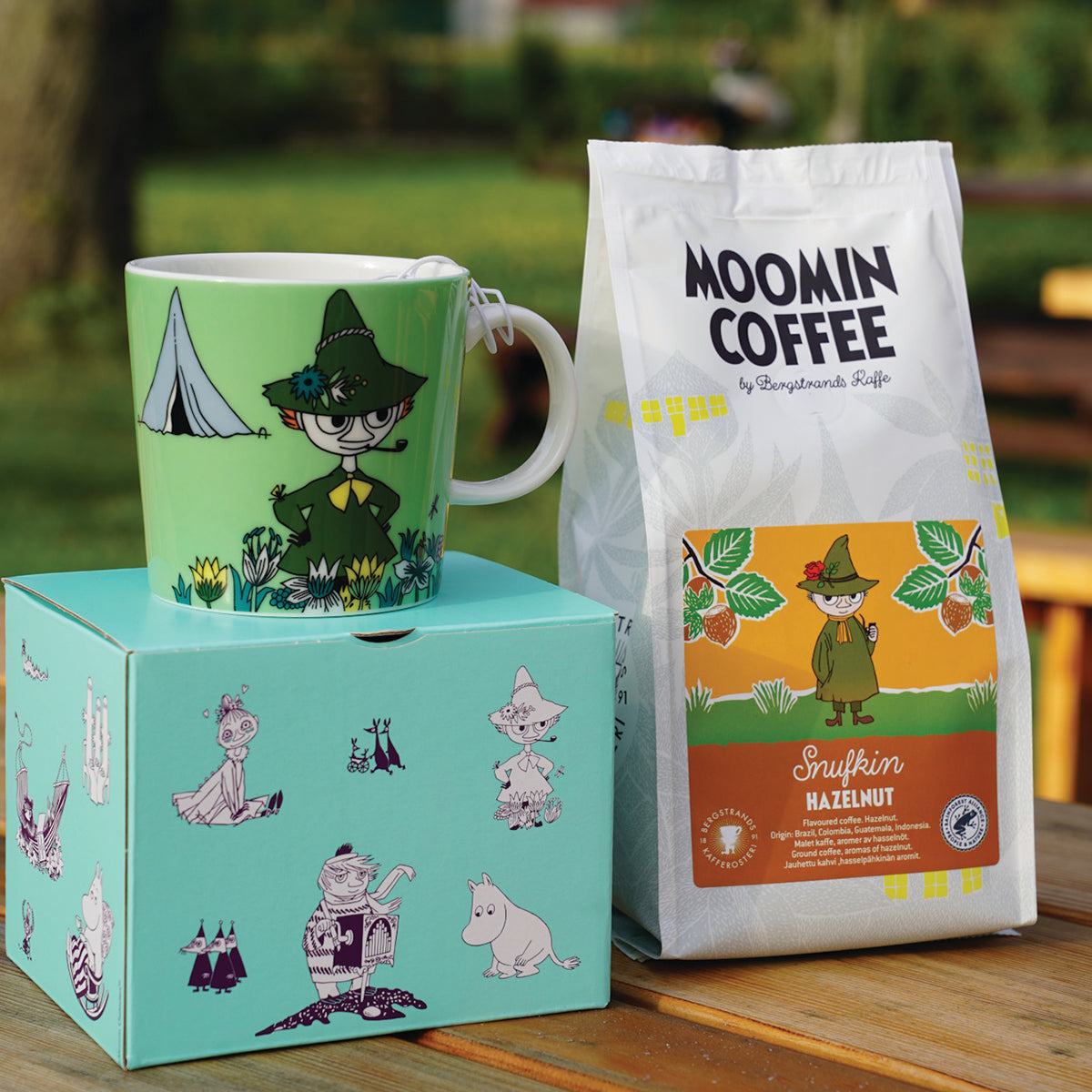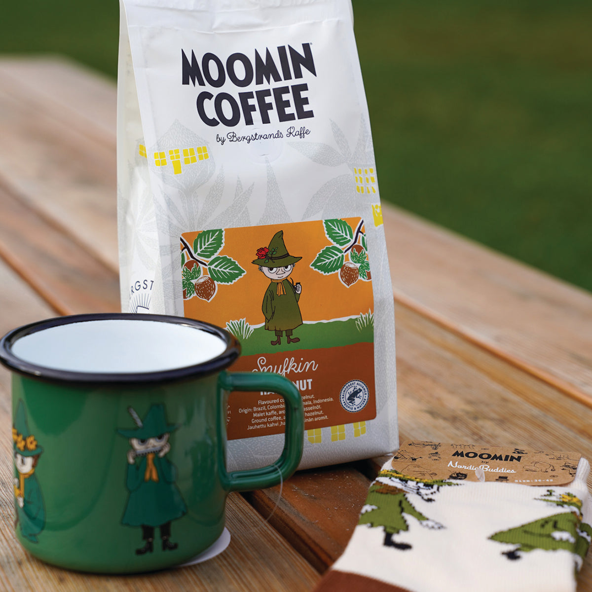 OFICJALNY MOOMIN SHOP POLSKA Zestaw 3-el. kubek emaliowany 370ml Włóczykij Muurla + kawa mielona Włóczykij 250g Bergstrands + skarpety 40-45 NordicBuddies