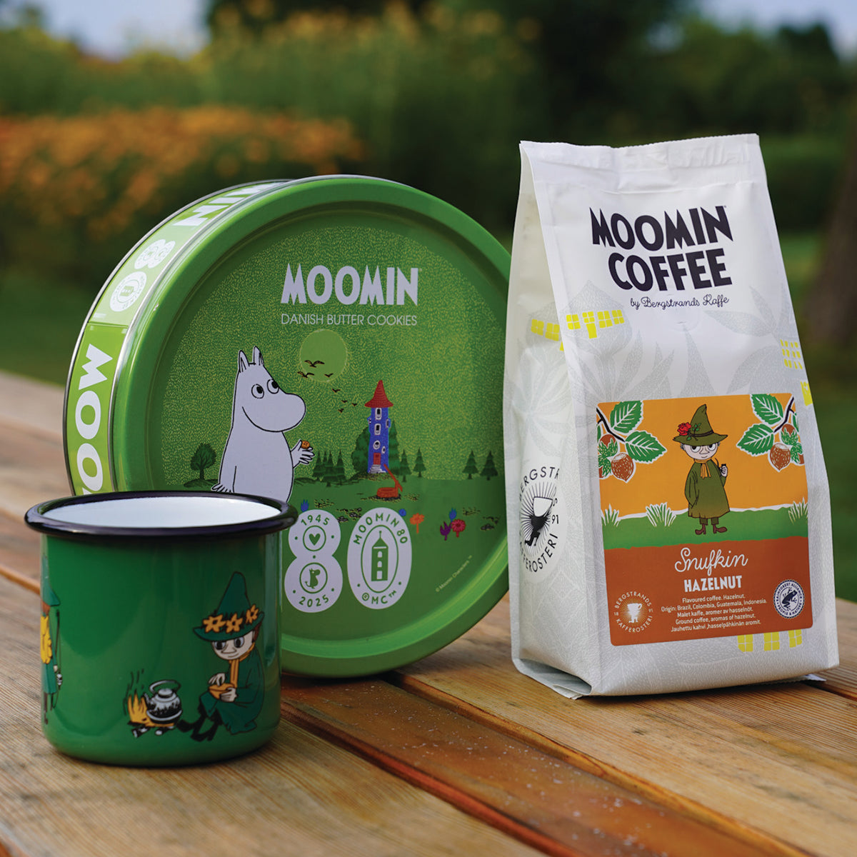 OFICJALNY MOOMIN SHOP POLSKA Zestaw 3-el. kubek emaliowany 370ml Włóczykij Muurla + kawa mielona Włóczykij 250g Bergstrands +ciastka maślane w puszce 340g House of Denmark