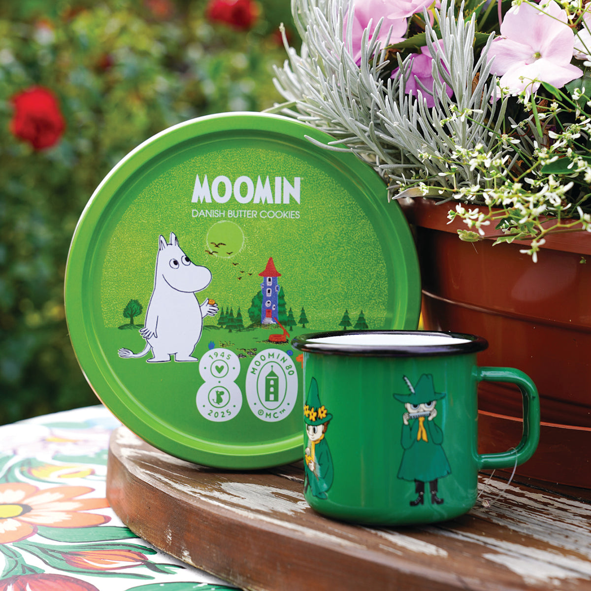 OFICJALNY MOOMIN SHOP POLSKA Zestaw 2-el. kubek emaliowany 370ml Włóczykij Muurla + ciastka maślane w puszce 340g House of Denmark