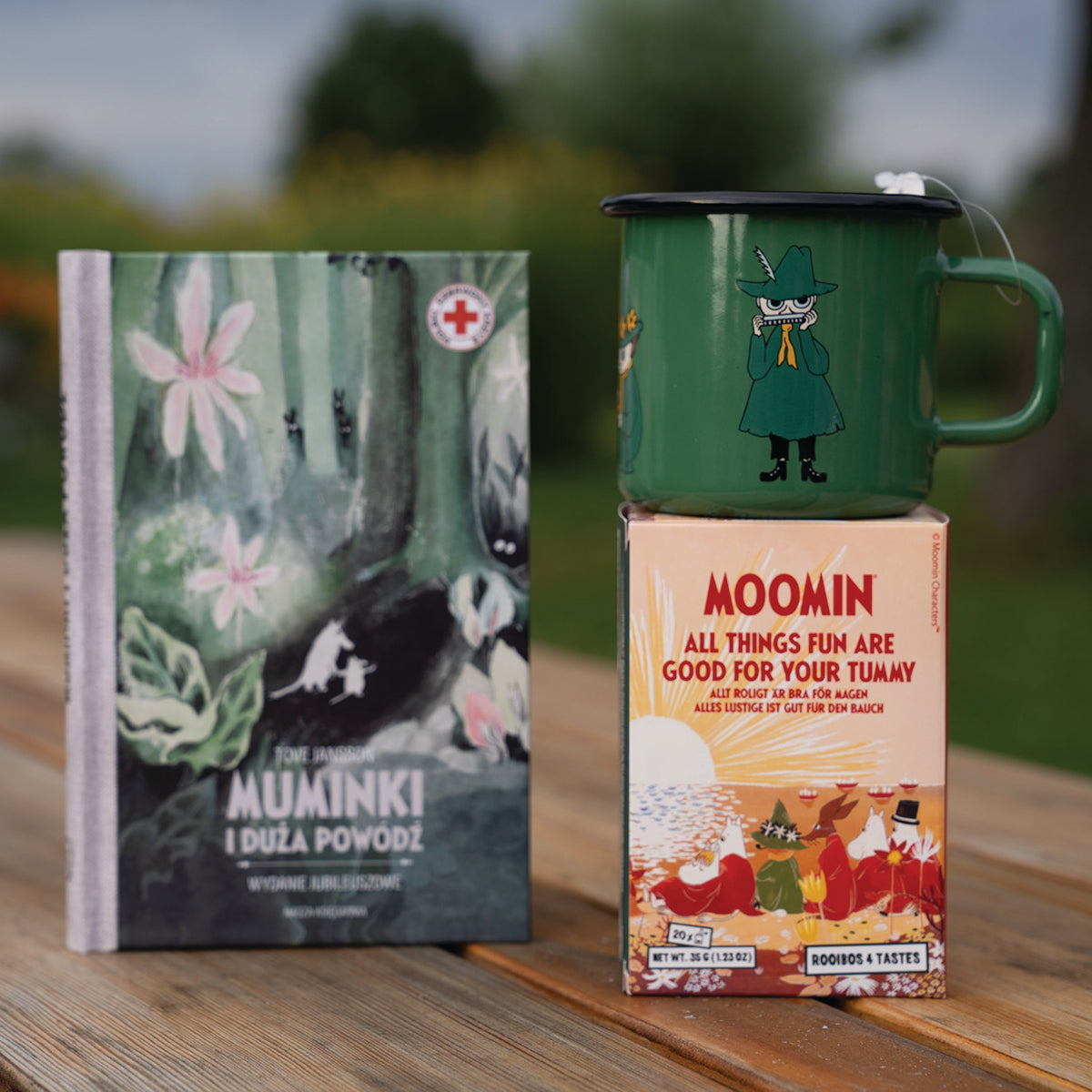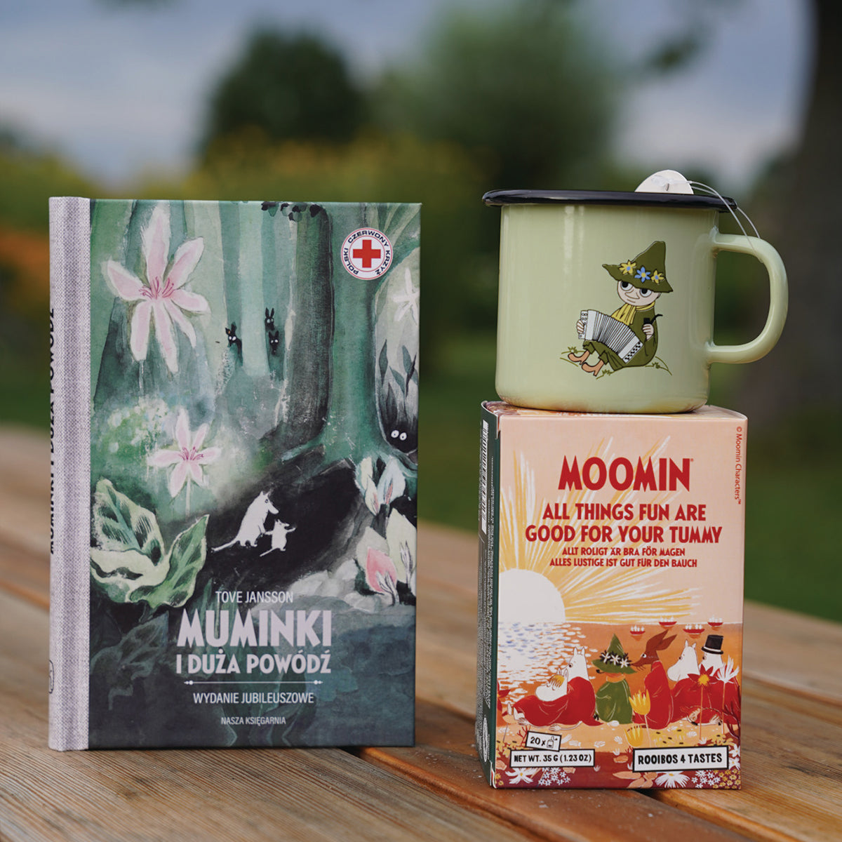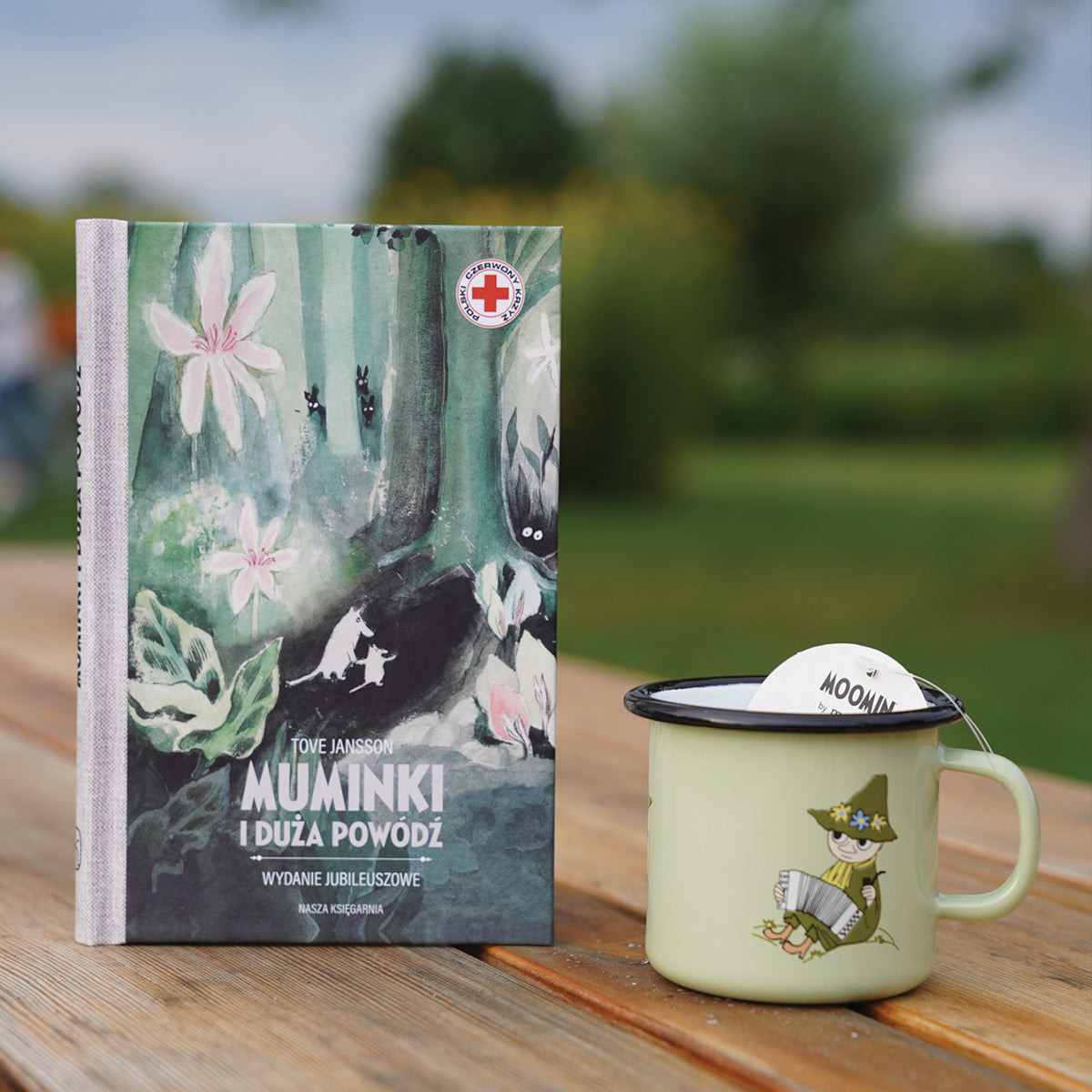 OFICJALNY MOOMIN SHOP POLSKA Zestaw 3-el. kubek emaliowany 250ml Włóczykij Muurla + książka Muminki i duża powódź Nasza Księgarnia + Herbata w torebkach Nordqvist