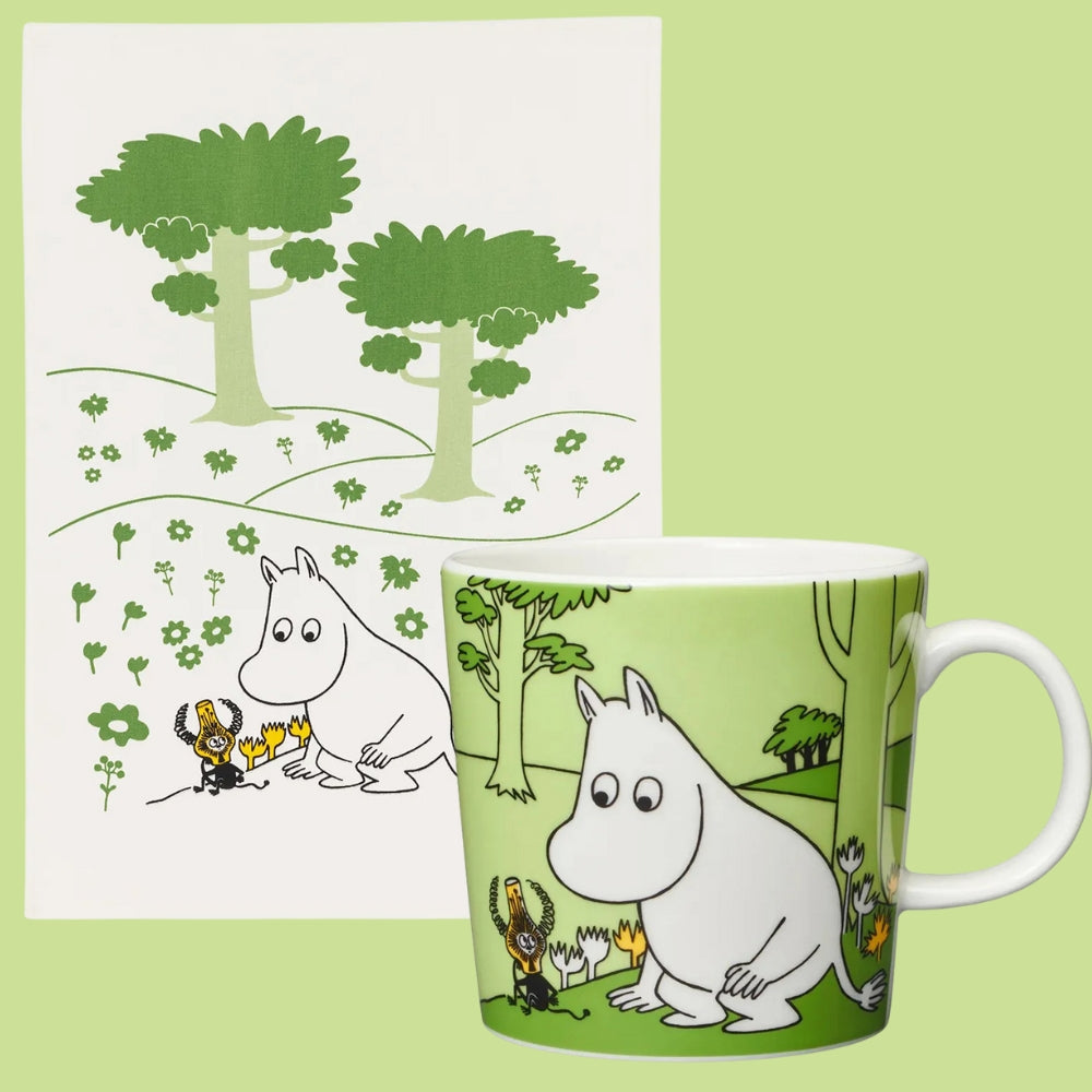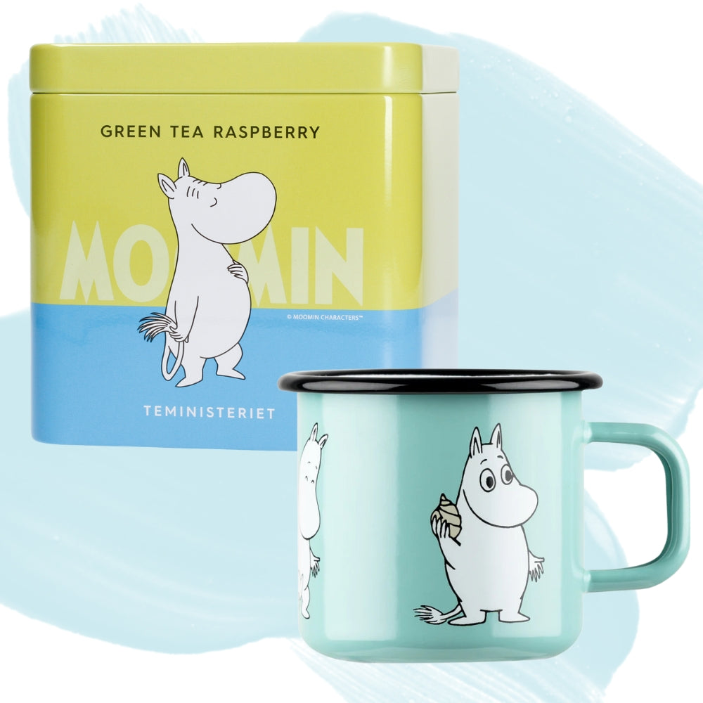 Teministeriet Zestaw herbata Moomin Green Tea Raspberry 100g Teministeriet i kubek emaliowany 370ml Muminek Muurla