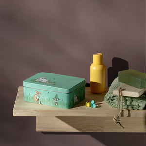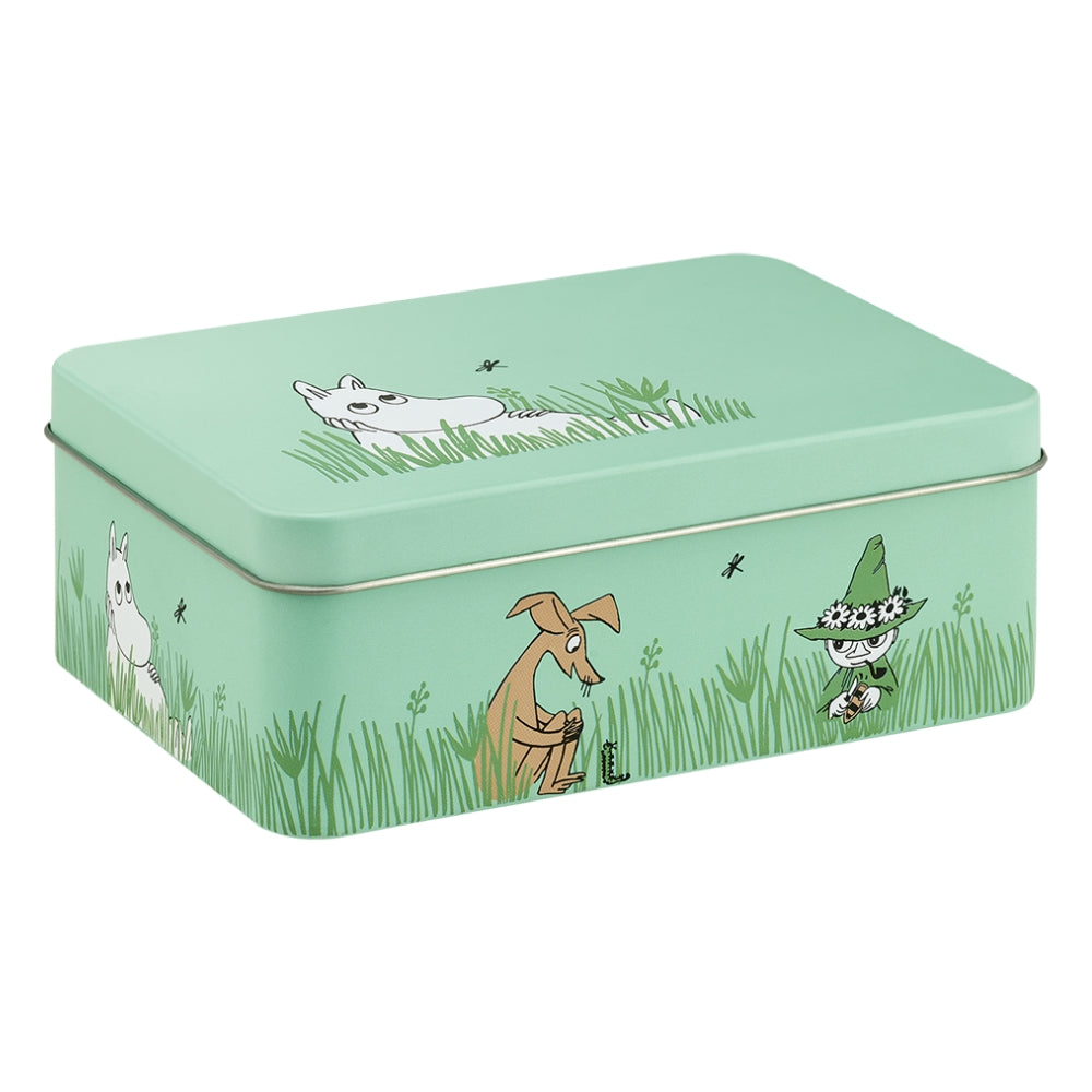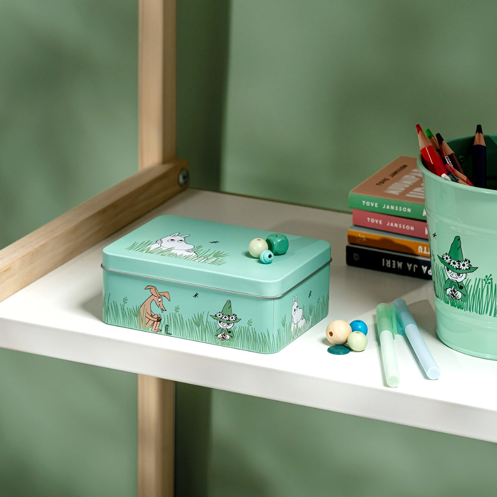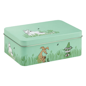 Metalowa puszka Boys ozdobiona jest delikatnym, zielonym tłem oraz uroczą ilustracją Muminka, Włóczykija i Ryjka odpoczywających w letniej trawie. Dzięki szczelnej pokrywce doskonale sprawdzi się do przechowywania ciasteczek, cukierków, materiałów plastycznych oraz innych drobnych skarbów.