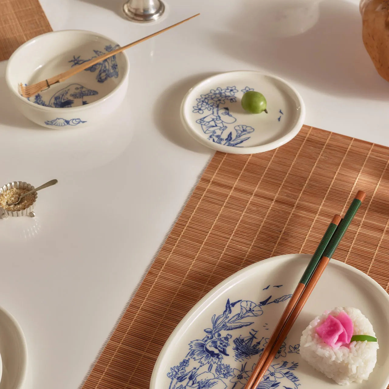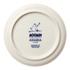 Harmonijna niebiesko-biała kolekcja zastawy stołowej z nutką japońskiego stylu jest hołdem dla życia i twórczości Tove Jansson. Projekt inspirowany jest delikatnymi, namacalnymi kształtami skalistej wyspy Klovharun, zwanej Haru, gdzie Tove spędzała lato. Haru to również japońskie słowo oznaczające wiosnę. Ilustracje inspirowane są wiankami zaprojektowanymi przez samą artystkę, celebrowane są w nich rośliny z wyspy. Talerzyk Muminki Arabia 12 cm.