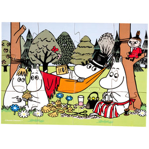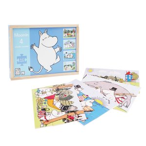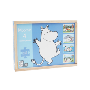 W tym pudełku znajdziesz 4 urocze i solidne drewniane puzzle z pięknymi motywami ze świata Muminków. Puzzle są zapakowane w pudełko z praktyczną, przesuwaną pokrywką, dzięki czemu łatwo je przechowywać po zakończonej zabawie. Solidne, drewniane puzzle posłużą przez wiele dobrych lat.
