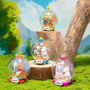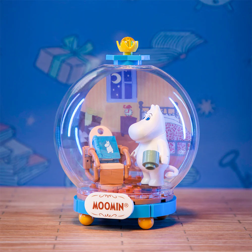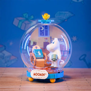 Model z klocków przedstawiający Muminka w jego otoczeniu.Zestaw zachwyca urokliwymi detalami, takimi jak: tło sypialni Muminka, figurka bohatera trzymającego kubek kawy i odpoczywającego na fotelu oraz żółta kryształowa kula zdobiąca górę obudowy.